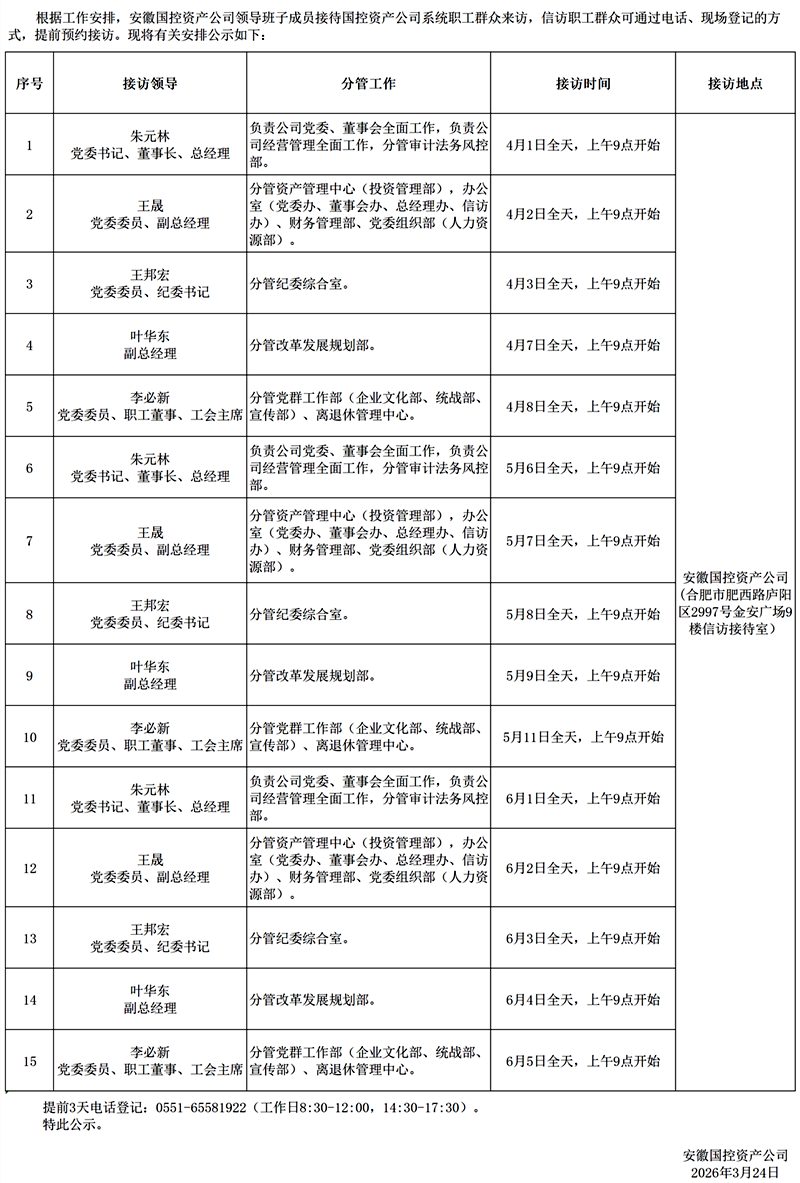 当前位置:首页>>新闻中心>>通知公告>>安徽国控资产公司领导班子成员2026年4-6月份接访公示