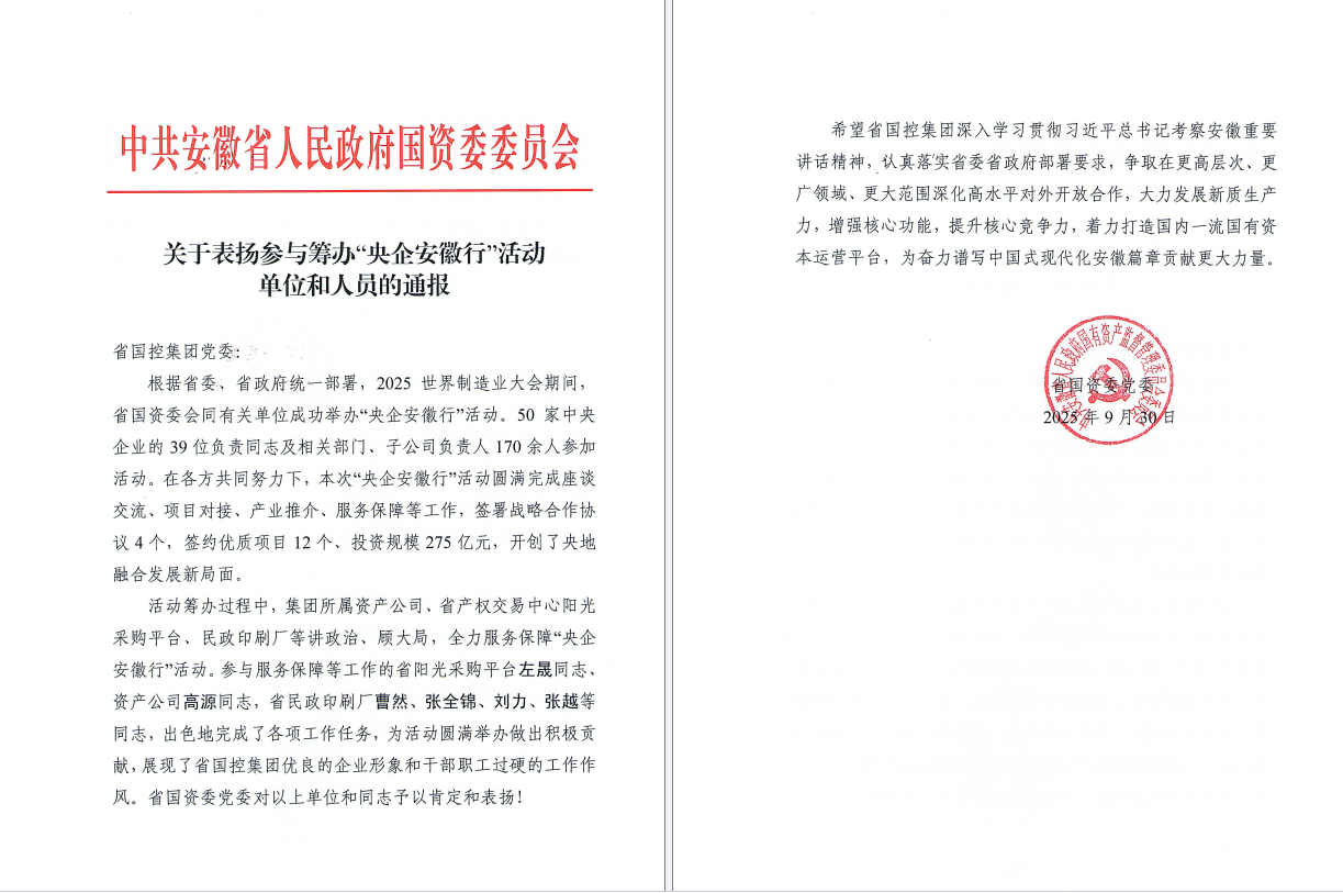 分享到近日,公司收到集团转发的省国资委发出的表扬通报,通报中高度肯定了公司曹然、张全锦、刘力、张越、高源等同志在2025年世界制造业大会期间,省国资委会同有关单位举办的“央企安徽行”活动中所作的贡献,他们在工作中体现了专业水平和敬业精神,展现了省国控集团优良的企业形象和干部职工良好的工作风貌,给省国资委留下深刻印象。